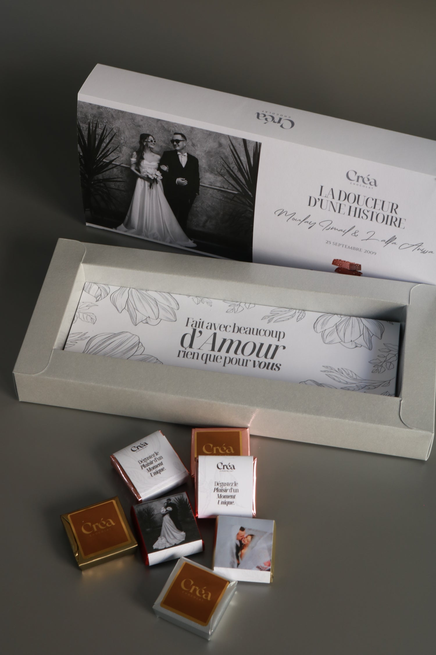 Découvrez l'élégance d'un cadeau exceptionnel avec notre boîte de chocolat personnalisée premium, conçue pour sublimer chaque moment spécial. Composée de 12 délicieux carrés de chocolat, chaque bouchée est un voyage gourmand avec une variété d’arômes raffinés :amande croquante,noisette fondante,pistache subtile, et caramel onctueux, le tout dans un équilibre parfait entre saveurs et textures.