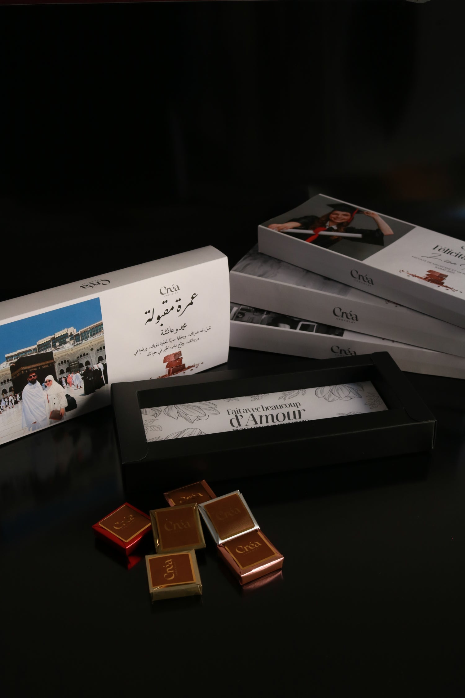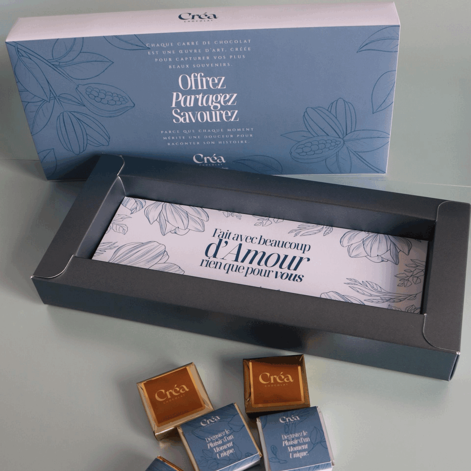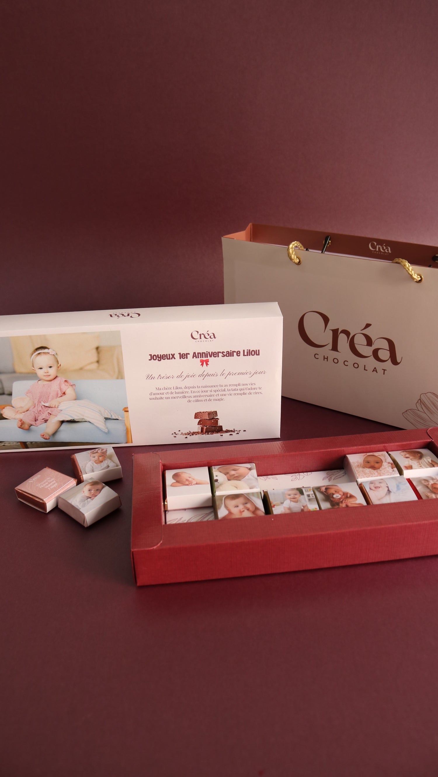 Chaque carré est soigneusement emballé, mettant en valeur vos photos, vos souvenirs, ou un message spécial, pour transformer ce coffret en une œuvre d’art gourmande.